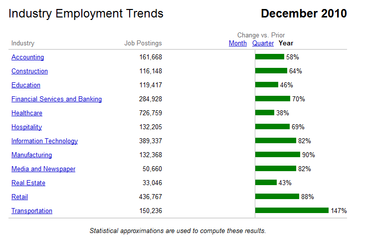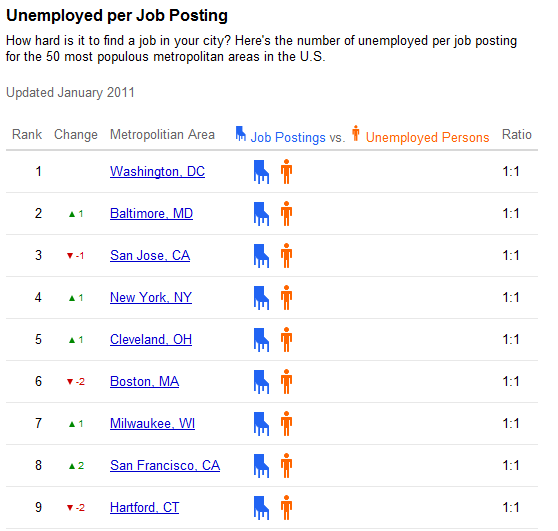 The truth of the matter is that jobs are out there and they are abundant. At the end of 2010, areas like the San Francisco Bay Area, Washington DC, Baltimore, San Jose, Cleveland, Boston, Seattle, Austin, Denver, Charlotte, Atlanta, and other big cities had around 100 job listings for every 1,000 people in the area. San Jose topped the list with 162 job openings for every 1,000 people. Other cities like New York, Chicago, and Pittsburgh had just under 50 job openings for every 1,000 people. (See job map.)
