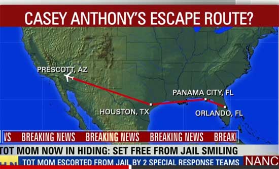 Nancy Grace is speculating that Casey Anthony may be in hiding near Hollywood according to last night’s show. The image above shows the possible escape route Grace says Anthony took in a private jet.